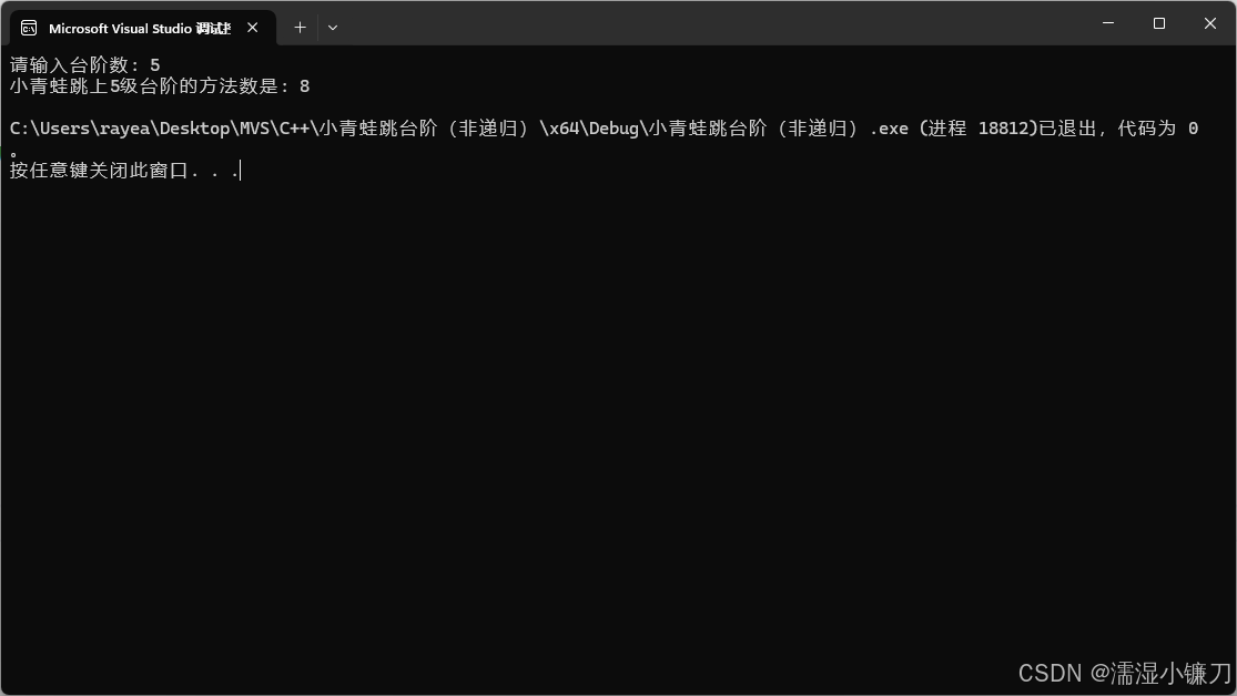 cout << "小青蛙跳上" << n << "级台阶的方法数是: " << frogJumpNonRecursive(n) << endl;