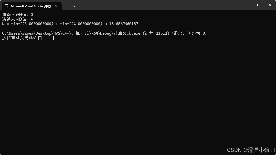 cout << "k = sin^2(" << r << ") + sin^2(" << s << ") ≈ " << result << endl;