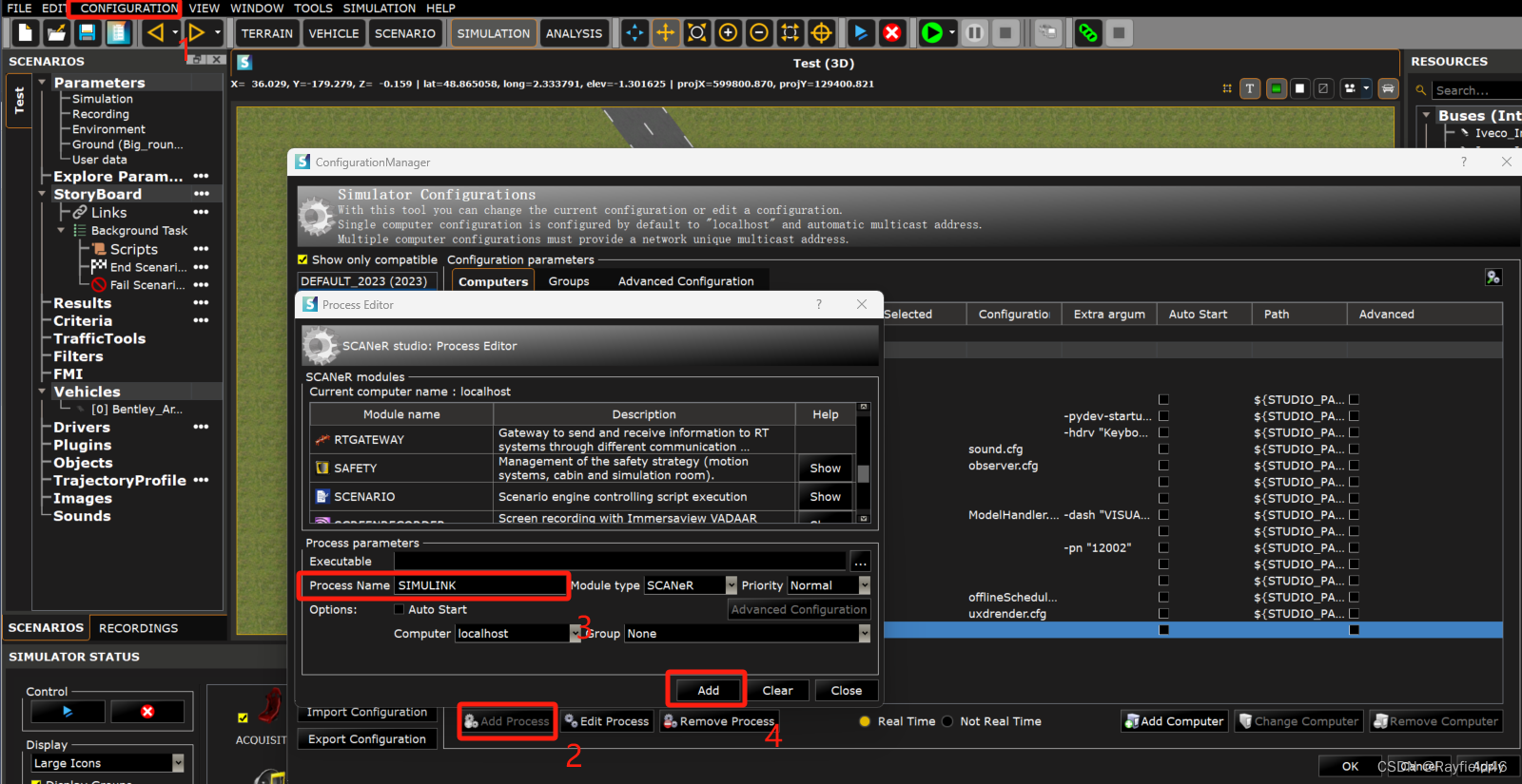 现在我们回到SCANeR,点击Configuration>Add Process>在Process中填入Simulink模块名称,填什么都行,但是不能重名,且必须与Simulink的Controller设置的一致。