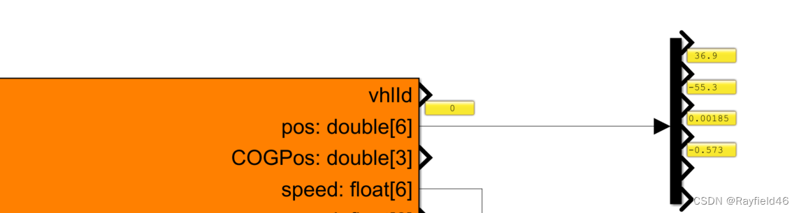 这个Input模块的部分输出口含有不止一个信息,需要连接一个demux块用于解析,以下图为例,我们可以链接一个六端口的demux到Pos:Double[6]这个输出口,读取车辆的xyz位置、Heading、Pitch、Roll。