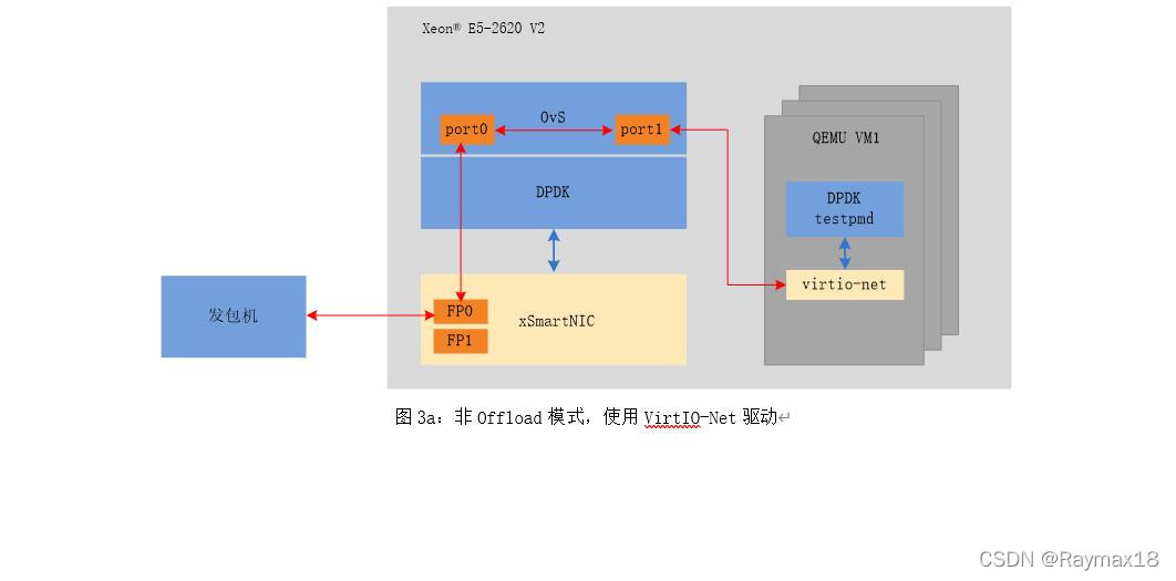 使用VirtIO 方式时如下图3a所示,port1为Vhost-user类型端口,QEMU虚拟机使用对应的VirtIO-Net驱动并且testpmd使用单核单队列方式转发数据。