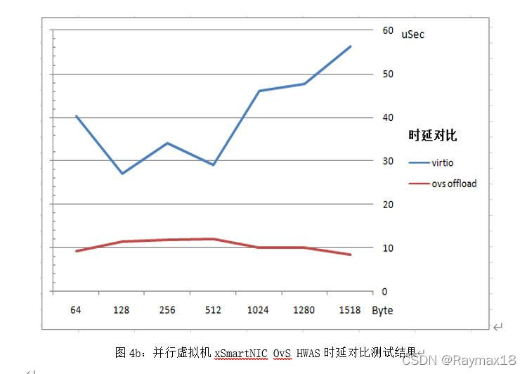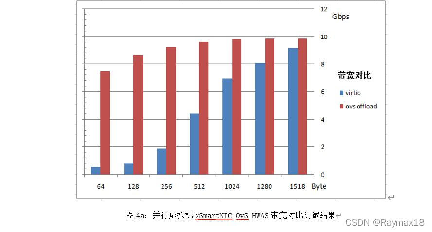 按照上述两种方式,当PF0处理4台虚拟机时(每台虚拟机独立转发数据包),带宽和时延对比测试如下图4所示,结果表明xSmartNIC HWAS加速功能能极大提升虚拟机的网卡带宽和降低网络时延。
