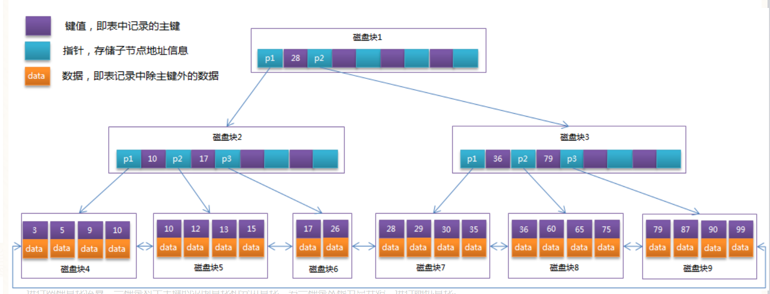 Optimize the B-Tree in the previous section. Since the non-leaf nodes of B+Tree only store key value information, assuming that each disk block can store 4 key values and pointer information, the structure after becoming B+Tree is as follows The picture shows: