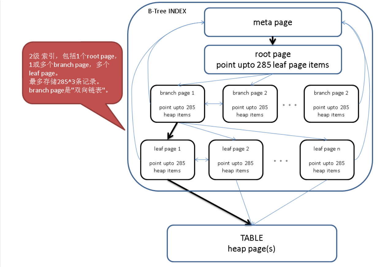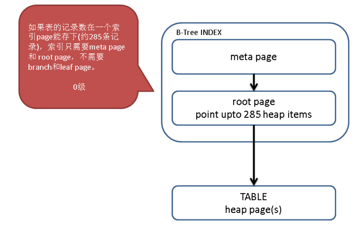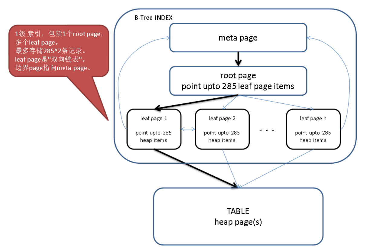 随着记录数的增加,一个root page可能存不下所有的heap item,就会有leaf page,甚