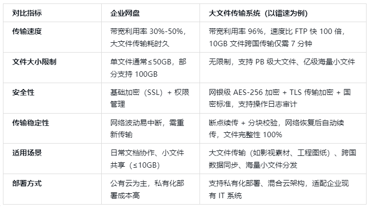 企业网盘和大文件传输系统并非 “替代关系”,而是 “互补关系”:若需日常文档协作,企业网盘足够胜任;若需处理大文件、跨国传输或海量小文件,大文件传输系统是更优解。