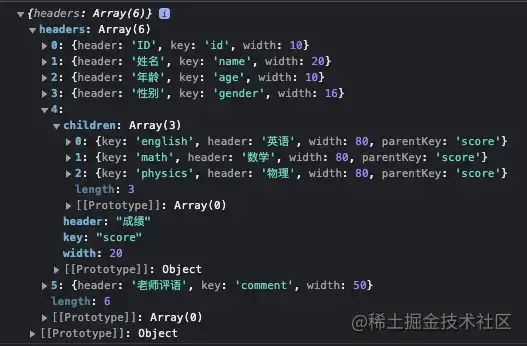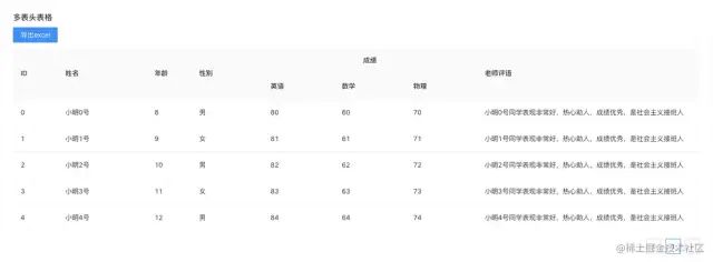 在导出多级表头表格的时候,我们写表头和数据行都是用的worksheet.addRow方法,而没有用 worksheet.column设置表格的表头,这样更加灵活,每一列想显示什么内容完全自己控制。