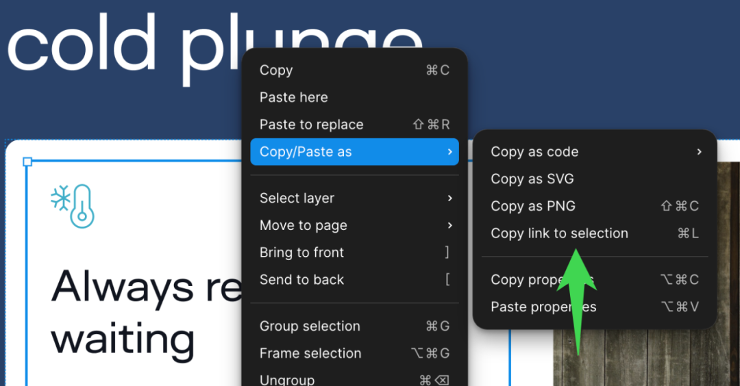 大多数 Figma 文件最终都会变得很大,所以你可能希望链接到文件中的特定框架或组。选中单个元素后,您可以按 CMD + L 复制该元素的链接。你也可以在上下文菜单中找到它: