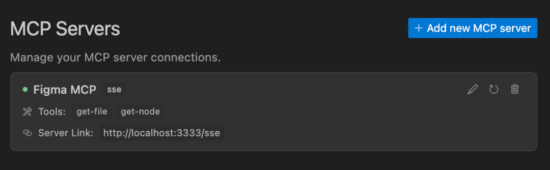 服务器连接成功后,在开始操作前,您可以确认 Cursor 已建立有效连接。如果看到绿色圆点且工具显示出来,那就没问题了!
