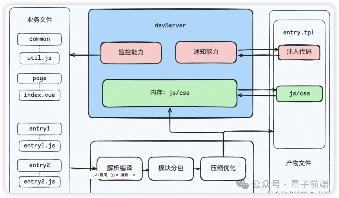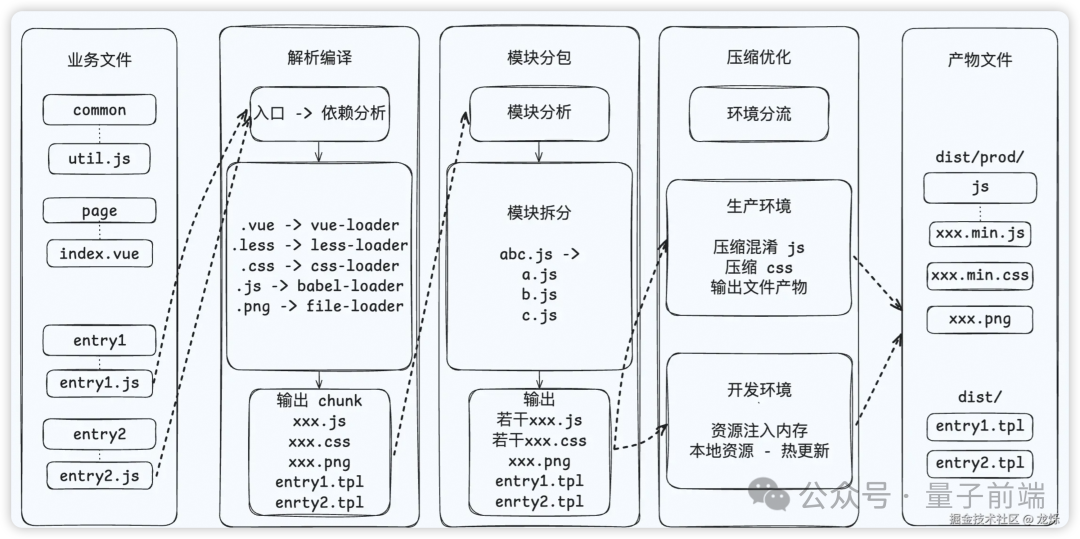 整篇文章都会围绕以下这张图讲解。最左边是多入口的业务文件,中间是构建打包三个阶段,最右边是产物文件。