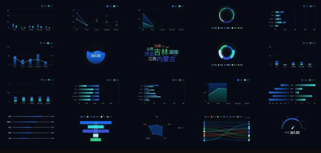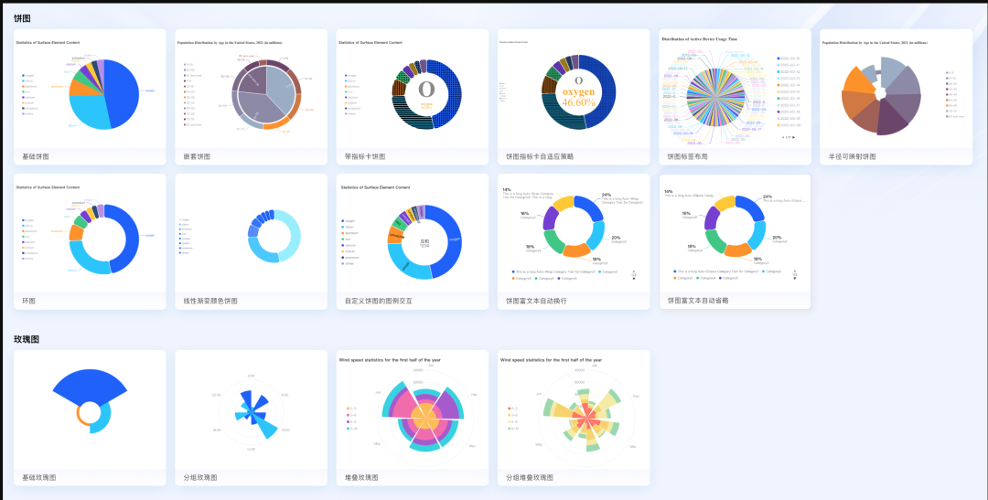 ② 丰富的图表类型:涵盖了从传统的统计图表到3D图表等多种类型,如柱状图、折线图、饼图、雷达图等,并且还支持3D版本的柱状图、饼图等。