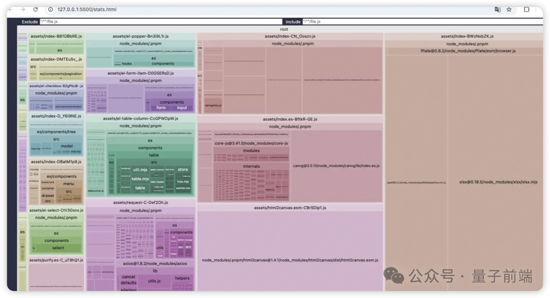 rollup-plugin-visualizer插件,是一个可视化工具,以图表的形式,展示打包结果的模块构成与体积分布。安装: