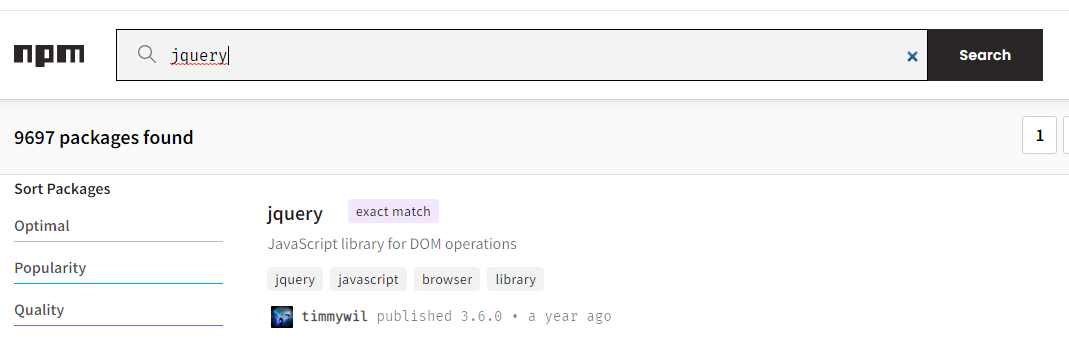 www.npmjs.com网站搜索,比如说我们要安装jquery - 安装的依赖不加版本号默认下载最新版本