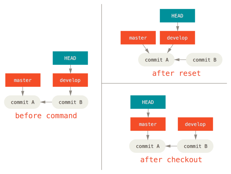 第二个重要的不同点在于如何更新 HEAD。reset 会移动 HEAD 分支的指向,而 checkout 只会移动 HEAD 自身来指向另一个分支。结合下图会更清晰的理解: