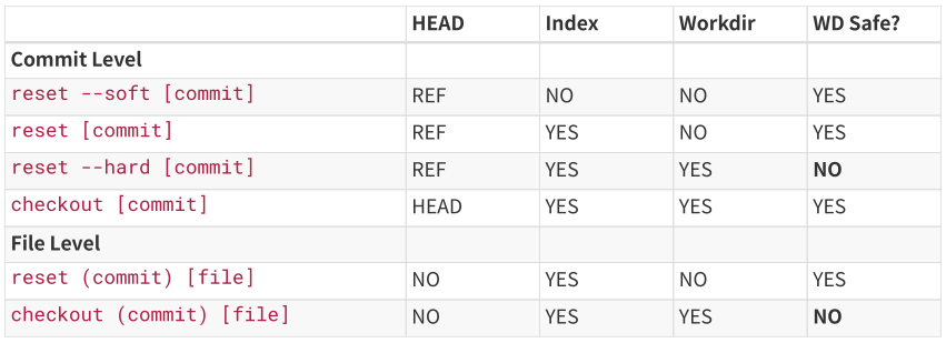6 重置和检出的总结速查。下面的速查表列出了命令对树的影响。"HEAD" 一列中的 "REF" 表示该命令移动了 HEAD 指向的分支引用,而"HEAD" 则表示只移动了 HEAD 自身。特别注意 WD Safe? 一列 - 如果它标记为 NO,那么运行该命令之前请考虑一下。