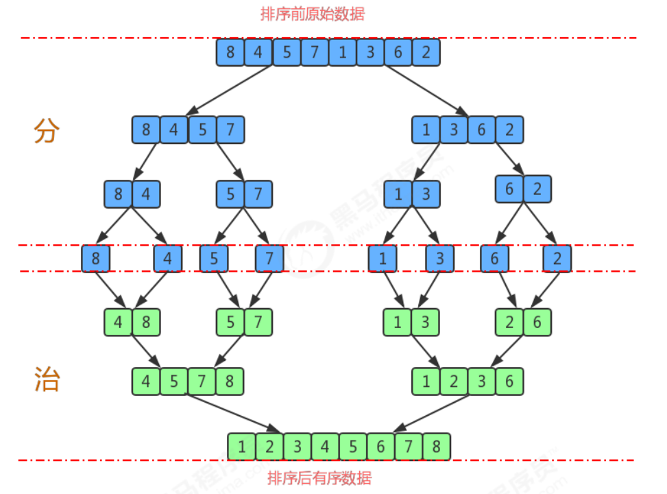 1.尽可能的一组数据拆分成两个元素相等的子组,并对每一个子组继续拆分,直到拆分后的每个子组的元素个数是1为止。