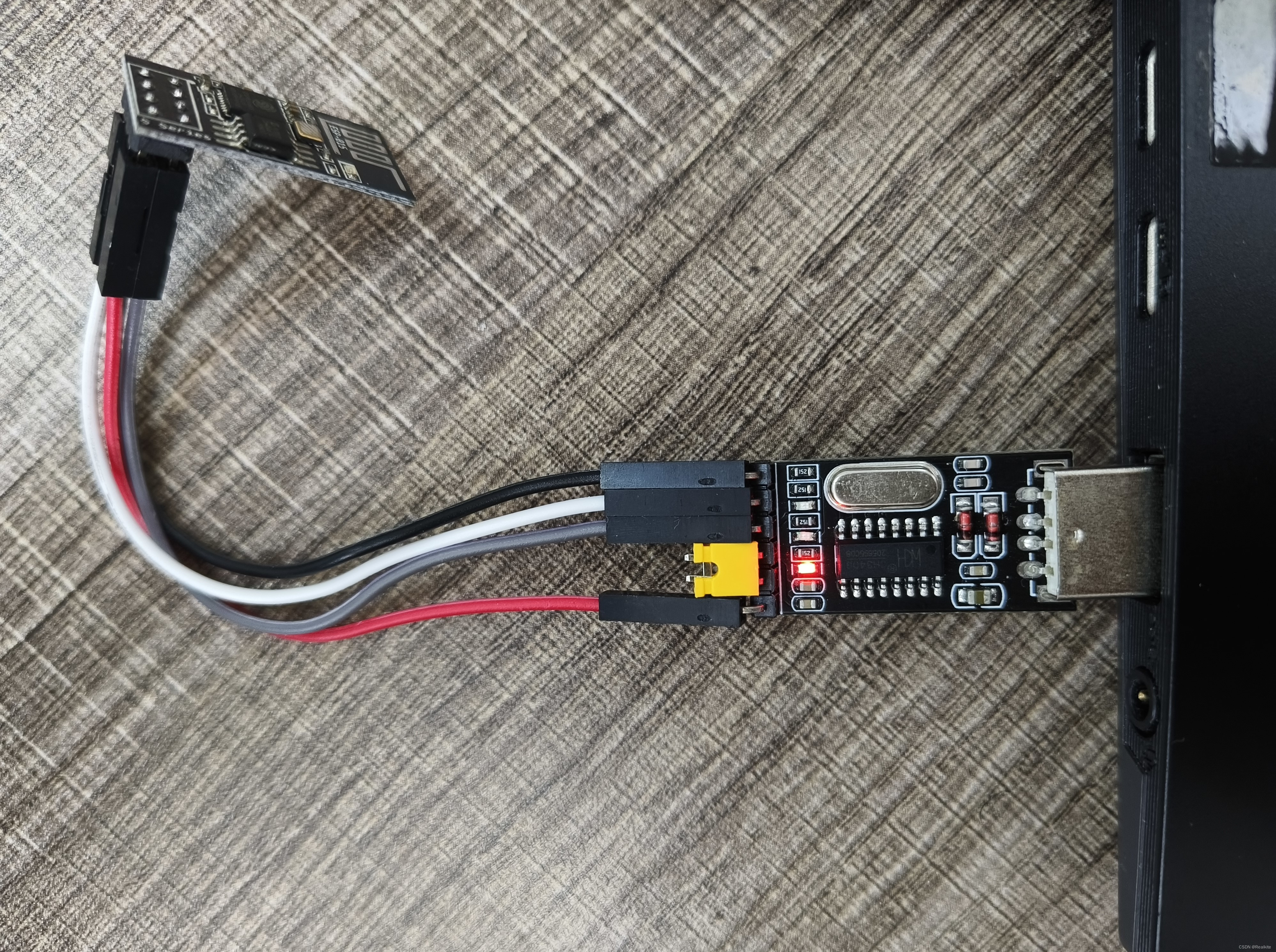 1、首先利用CH340(USB转TTL)模块实现ESP-01S模块与PC机的通信,这样就可以通过串口调试助手对ESP-01S模块发送AT指令进行测试。
