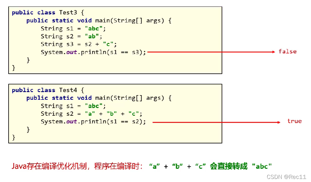 - 推荐使用String类提供的"equals" 比较:只关心内容一样即可