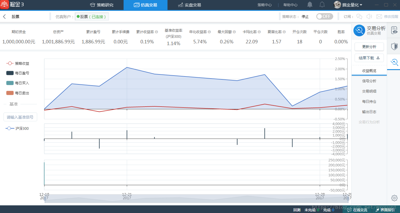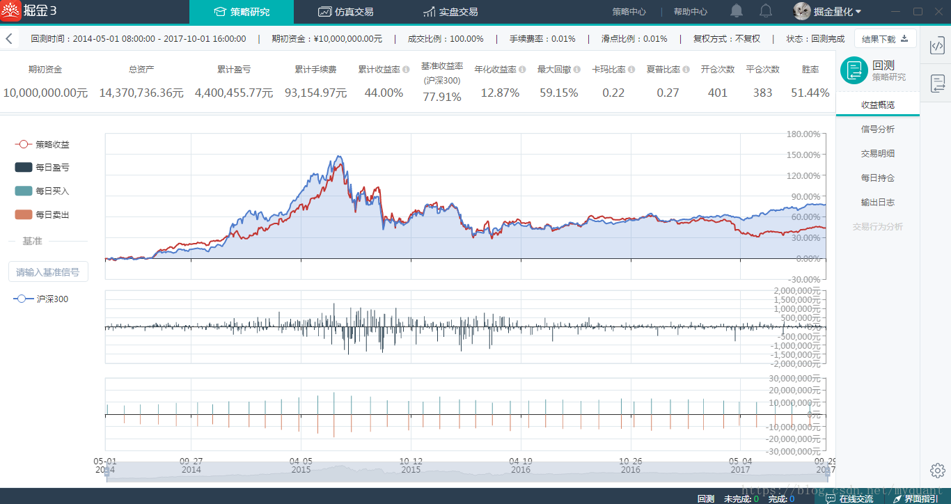 回测系统支持高精度、高性能Tick级回测;同时采用高速缓存机制,实现回测效率10倍提升。回测结束后,掘金3提供覆盖绩效分析、信号分析、交易明细以及每日持仓&收益信息的全面回测报告,帮助用户全方位分析策略效果。见图(5)