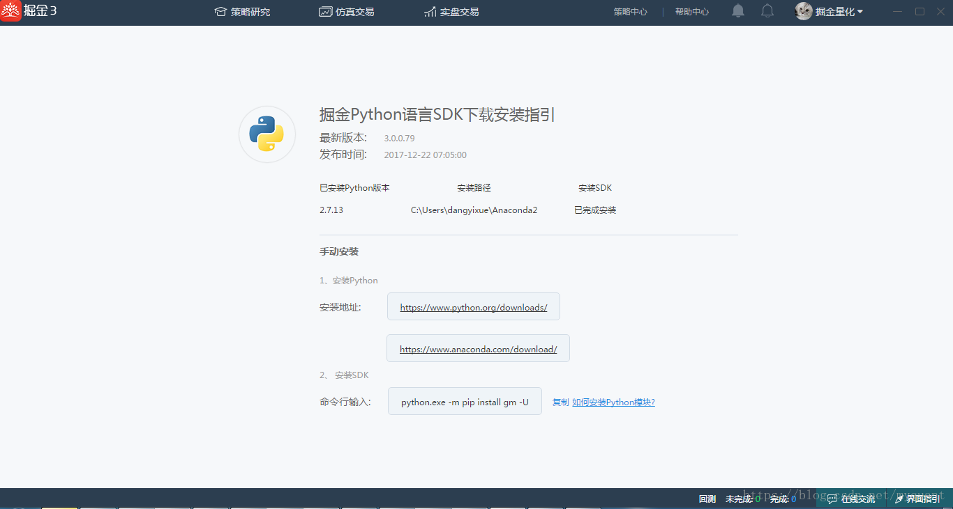 掘金3终端拥有自主检测环境匹配对应SDK,可根据界面提示安装anaconda及掘金Python语言SDK下载安装,见图(2)