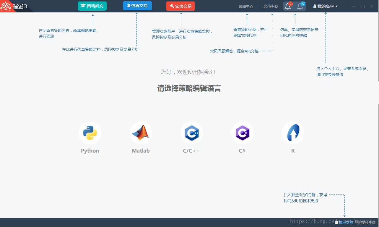 首先登陆掘金量化官网下载掘金3终端,安装到PC端桌面上,登陆终端后每个界面都给用户提供在线交流以及界面指引使用说明如图(1)