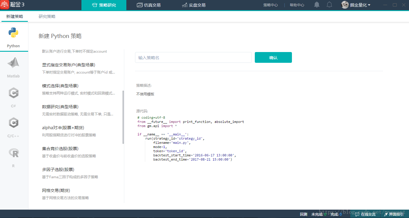 点击新建策略,掘金3提供了多种场景的代码框架以及丰富的示例策略,帮助用户快速了解掘金量化工具的使用,见图(3)