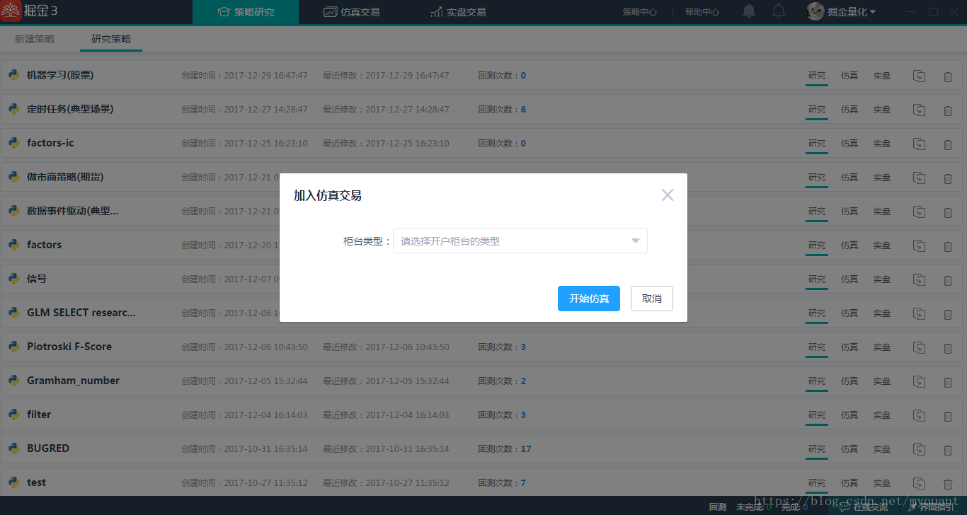 从回测到仿真,只需轻轻一单,再也不用重新修改代码啦。标准化的程序接口,统一的回测/仿真/实盘模型,帮助我们真正实现模式一键切换。见图(6)