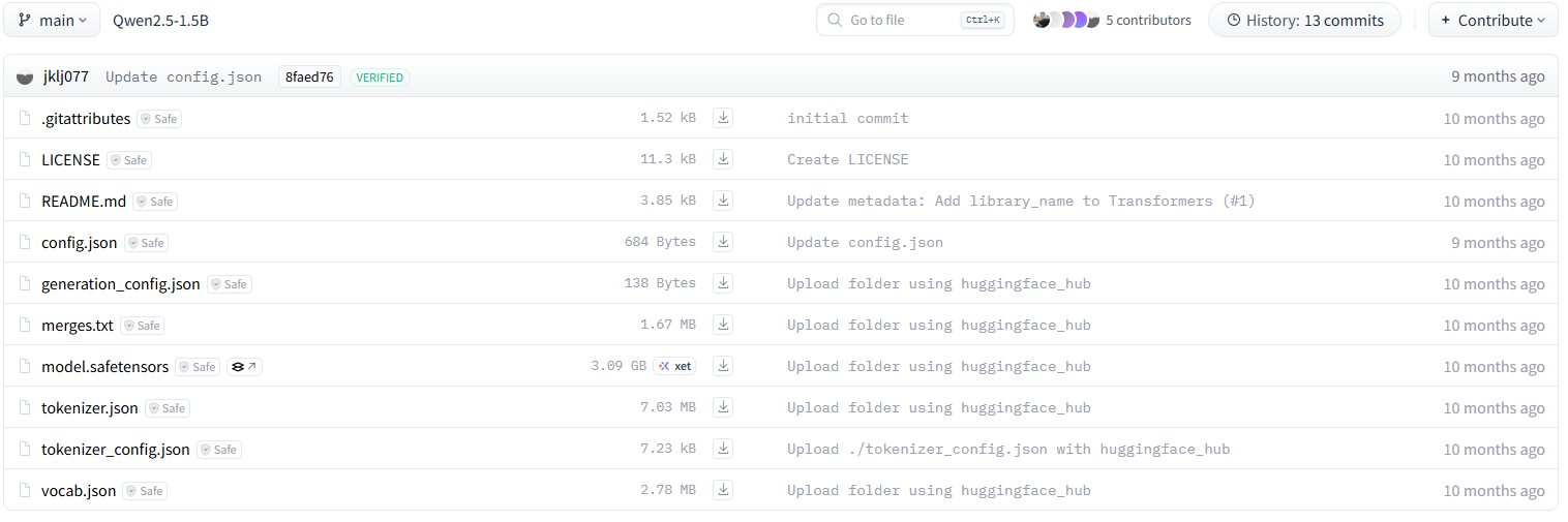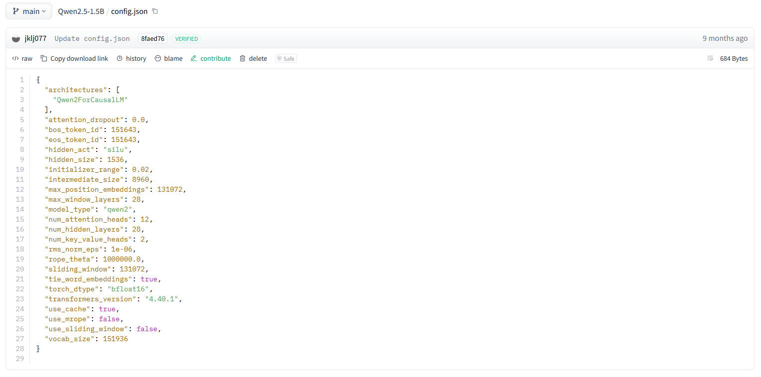 该界面即为 HuggingFace 社区中的 Qwen-2.5-1.5B 模型参数
