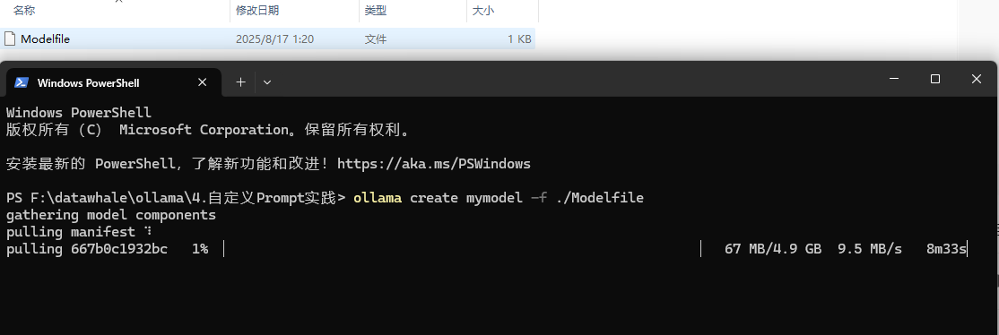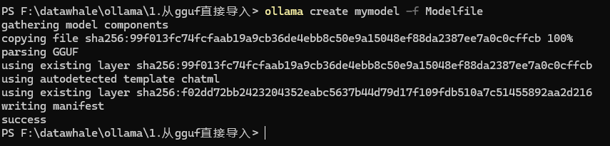3、在Ollama中创建模型(在Modefile文件所在的目录下运行以下终端指令)