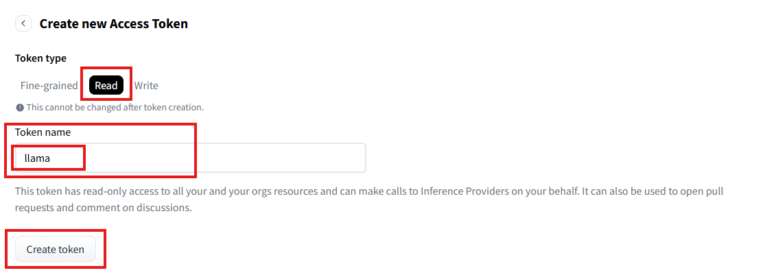在Token type选择Read,填写Token name,最后点击Create token。