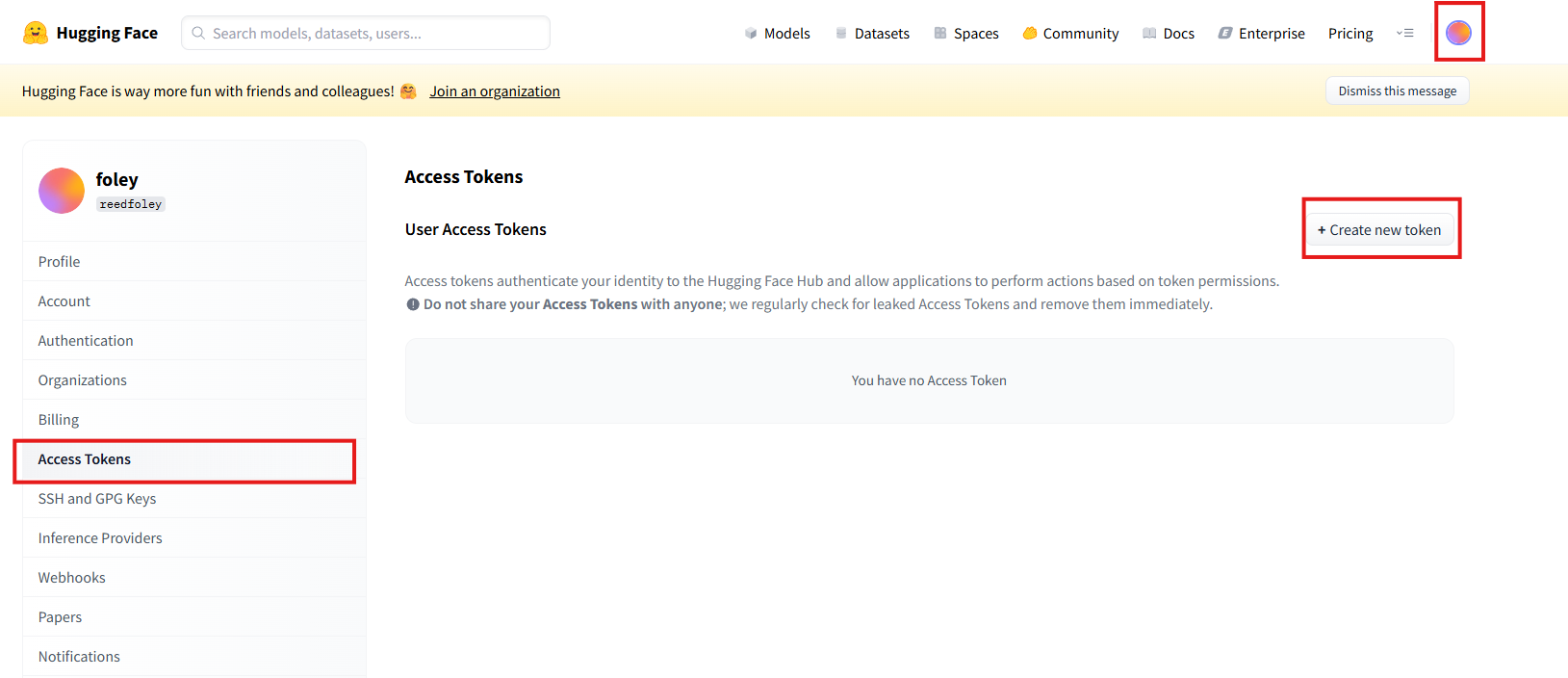 首先前往huggingface个人设置界面拿到用户个人的ACCESS_TOKEN.