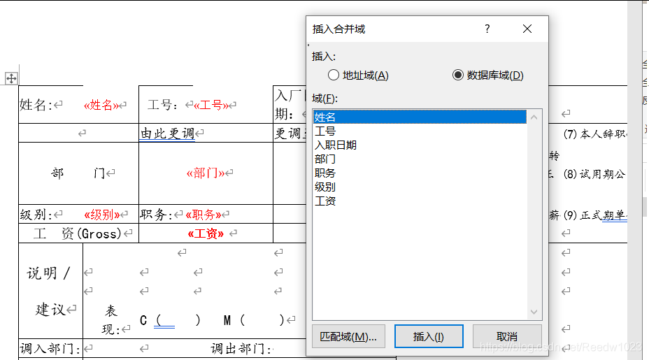 将模板粘贴到word中-邮件-选择收件人-使用现有列表将excel表格与word文档相连接-插入合并域