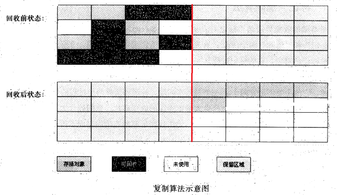 将可用内存按容量划分为大小相等的两块,每次只使用其中的一块。当这一块内存用完了,就将还存活的对象复制到另外一块上面,然后再把已使用过的那块内存清理掉。