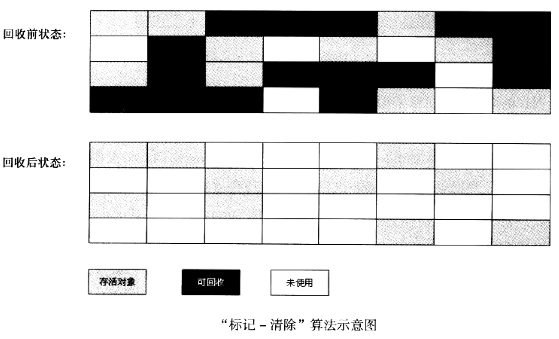 有两个不足之处:第一,效率问题,标记和清除两个过程的效率都不高;第二,空间碎片问题,标记清除之后会产生大量不连续的内存碎片,空间碎片太多可能会导致以后在需要分配较大对象时,无法找到足够的连续内存而不得不提前触发另外一次垃圾收集动作。