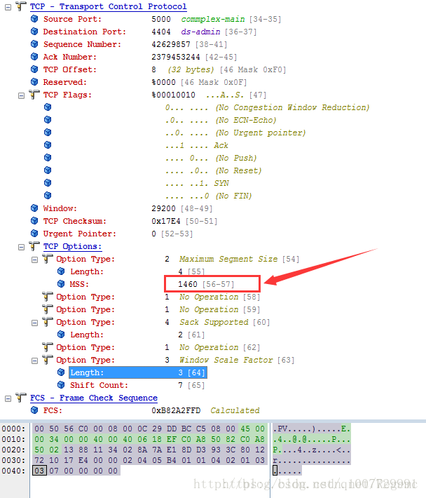 MSS 保存在 TCP 首部的可选项中,下图中显示 MSS 的值为 1260;