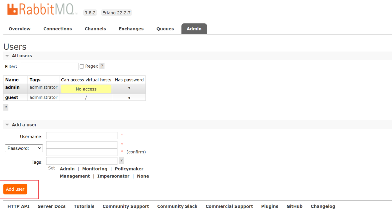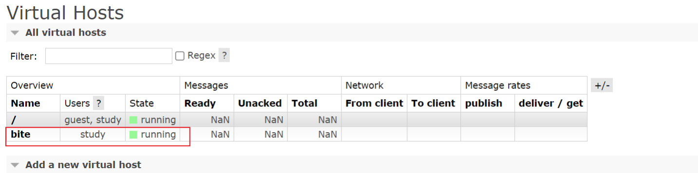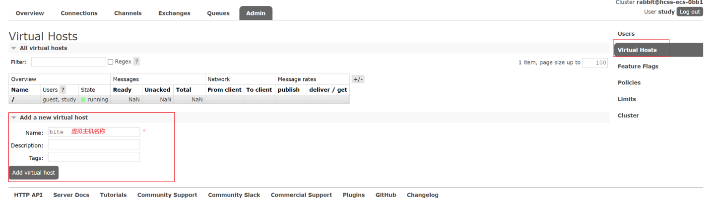 在Admin标签⻚下, 点击右侧 Virtual Hosts -> Add a new virtual host