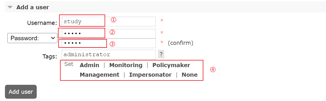 ①: 设置账号 ②: 设置密码 ③: 确认密码 ④: 设置权限 添加完成后, 点击[Add user]