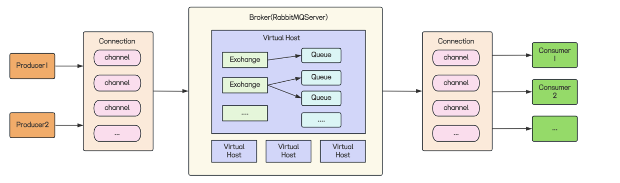 - Virtual Host可以看作是物流公司为不同的客⼾或业务部⻔划分的独⽴运营中⼼. 每个运营中⼼都有⾃⼰的仓库(Queue), 分拣规则(Exchange)和运输路线(Connection和Channel), 这样可以确保不同客⼾的包裹处理不会相互⼲扰, 同时提供定制化的服务