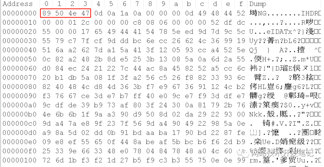 那么我们到底怎么来识别一个文件的类型呢?其实就是通过文件的魔数,也叫file magic,也就是每个文件都带有自己的特征,这个特征我们直接用对应软件打开看不到,但是windows通过Notepad++(安装HEX-Editor插件)或者linux通过hexdump工具查看文件的二进制数就可以看到。比如我们通过Nodepad++查看一个PNG文件: