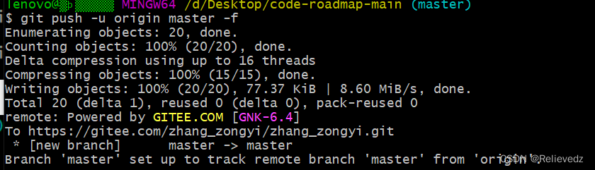 6、然后执行如下命令上传代码:git push -u origin master -f