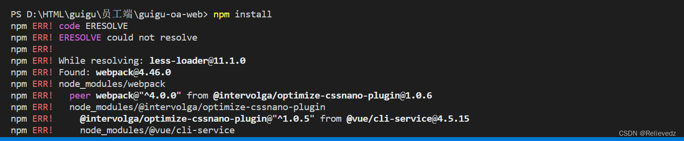 安装依赖时报错:npm ERR! code ERESOLVE npm ERR! ERESOLVE could not resolve npm ERR! npm ERR! While resolving