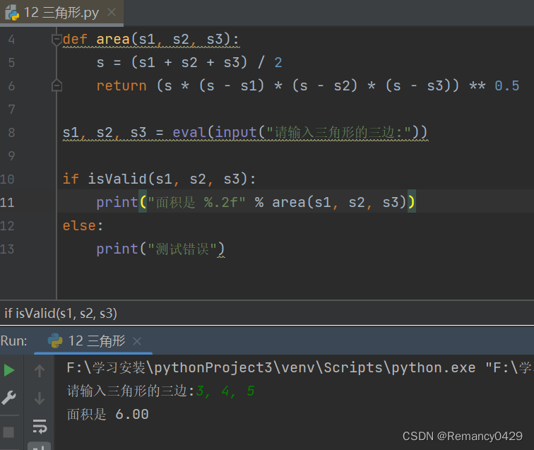 print("面积是 %.2f" % area(s1, s2, s3))
