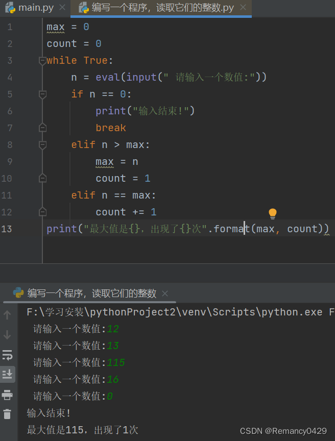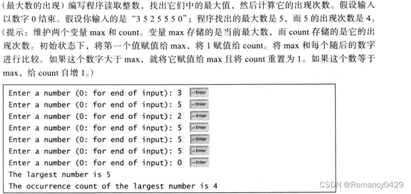 一、编写程序读取整数,找出它们中的最大值,然后计算它的出现次数,假设以数字0结束