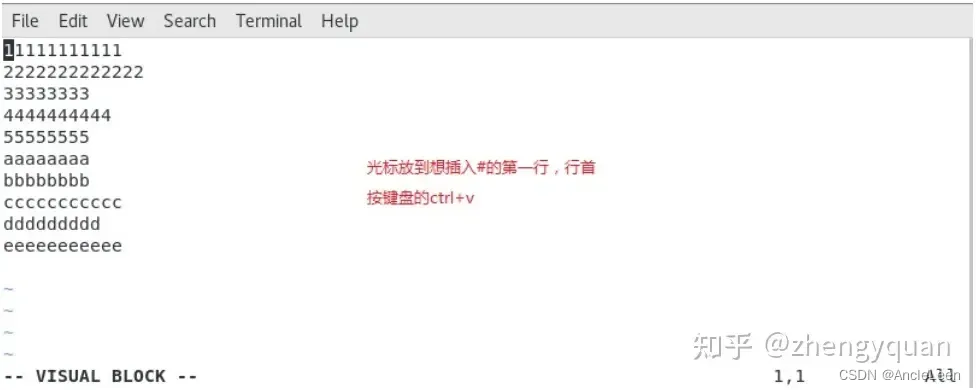 第二步: 然后按 Ctrl+v 进入可视化区块模式 (列模式)