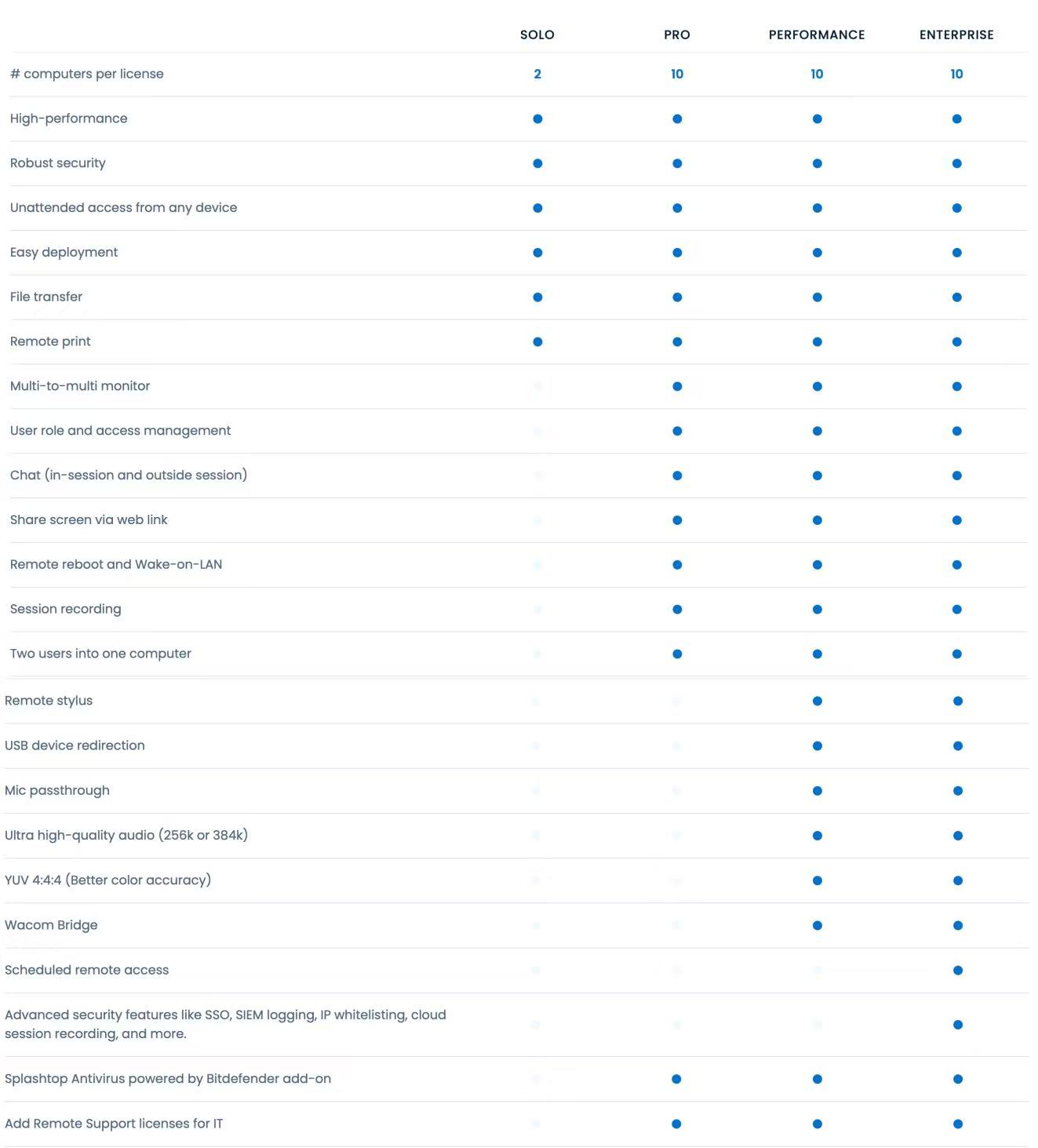 Splashtop:从技术到合规全面拉满。所有远程会话采用 TLS+256 位 AES 加密,搭配双因素认证、黑屏模式(被控端屏幕隐藏)、空闲会话超时、完整会话审计记录等功能,19 年运营从未爆出安全漏洞。此外,Splashtop 明确承诺 “不处理、存储用户远程会话中的任何设备数据”,隐私保护力度远超同行。