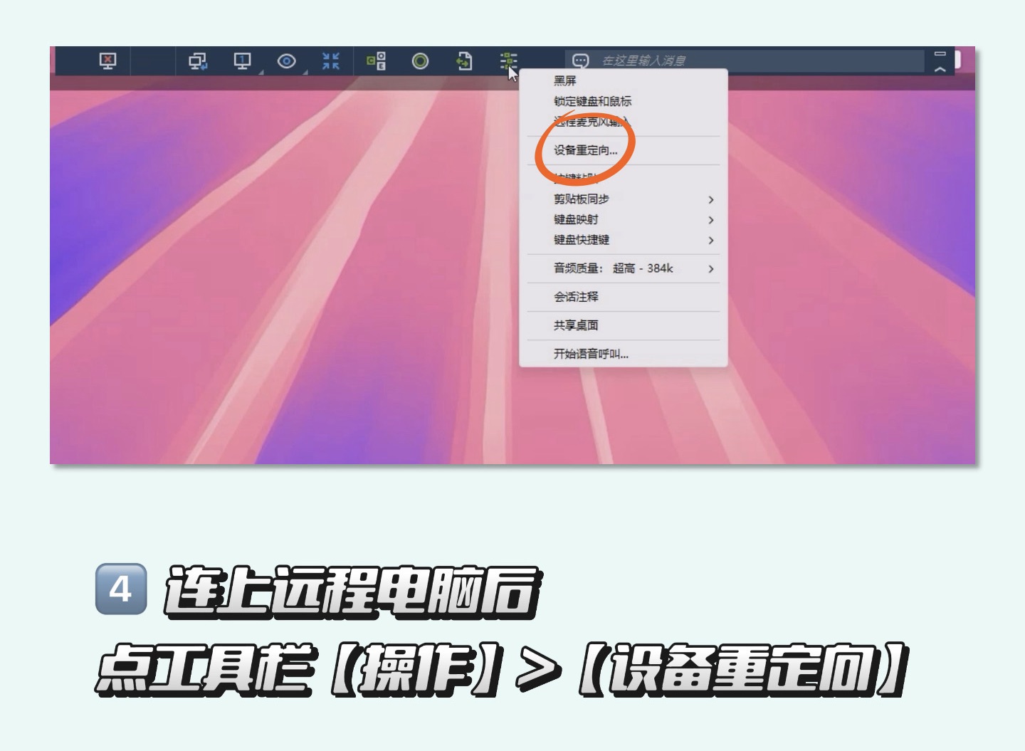 远程连接成功后,在 Splashtop 的工具栏里点【操作】→【设备重定向】,选择需要的设备点击右侧“重定向”即可。