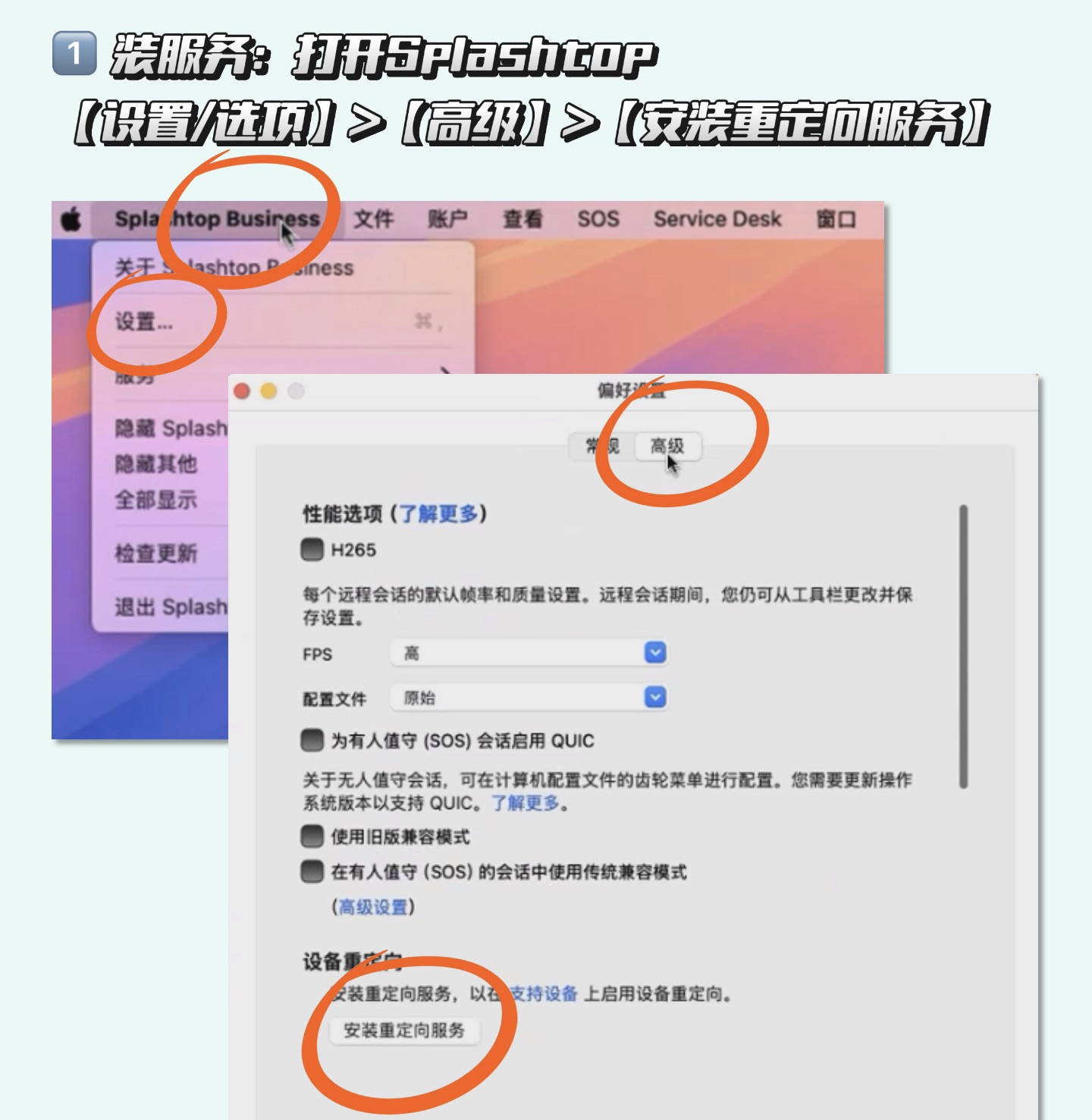 Windows 用户:打开 Splashtop 控制端,点【文件】→【选项】→【高级】,点击 “安装重定向服务”。