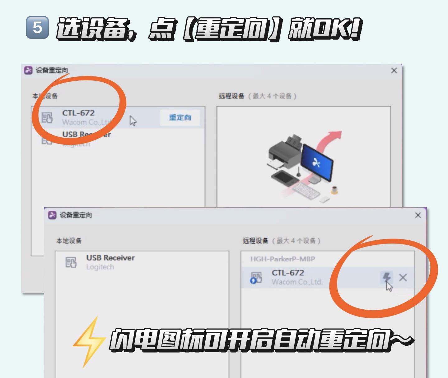 如果经常用某台设备,还能点旁边的 “闪电图标” 开启 “自动重定向”—— 下次再远程连接时,不用手动选设备,软件会自动把你常用的 USB 设备 “挂载” 到远程电脑上。
