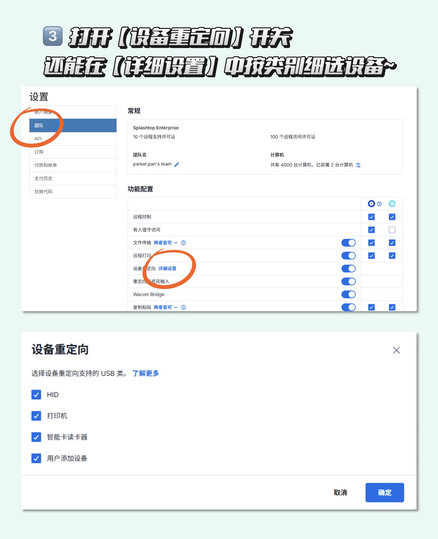 找到 “设备重定向” 选项点亮。如果想精准控制 “哪些设备能被重定向”,还能在【详细设置】里自定义勾选 —— 比如只让 U 盾和数位板生效,避免无关设备干扰。