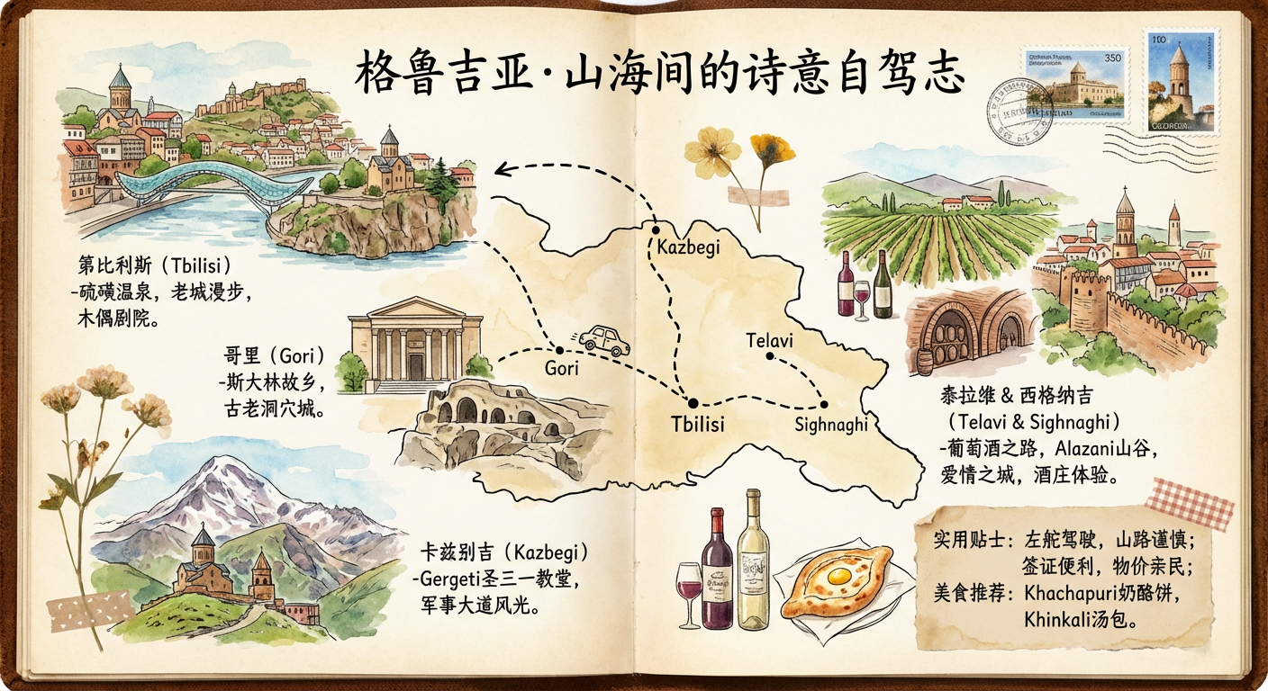 提示词:生成一张概括性的格鲁吉亚旅行攻略图,要求手帐形式,画面纯中文,精美画风。图中包括 Tbilisi - Gori - Kazbegi - Telavi - Sighnaghi 的自驾行程路线。